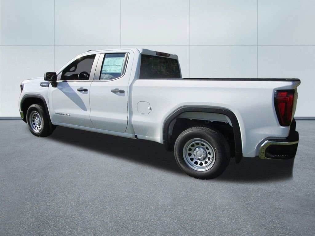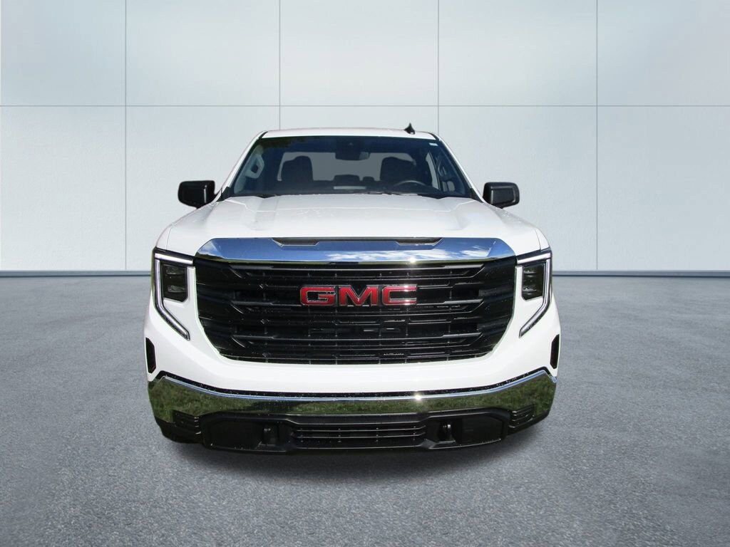The exterior of this Sierra 1500 Pro is finished in a sleek White color, complemented by the chrome header and flat black grille insert bars. The 17-inch silver painted steel wheels and power front and rear windows add a touch of style and functionality. Inside, the vinyl seat trim and 4-way manual driver and passenger seat adjusters provide comfort and practicality.